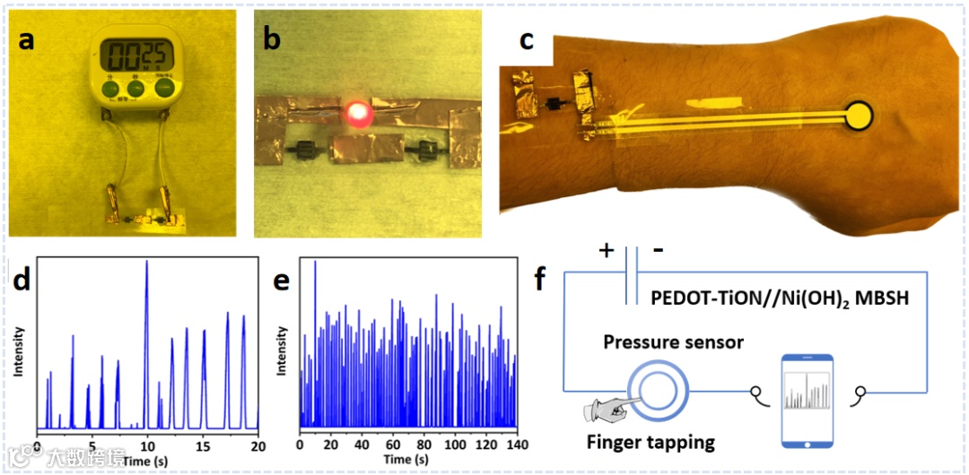 图6 由PEDOT-TiON//Ni(OH)2 MBSH供电的各种应用的数字照片图像。(a) 电子计时器,(b) 红色LED 和 (c) 压力传感器。(d)短(e)长的压力响应信号,(f)工作图。