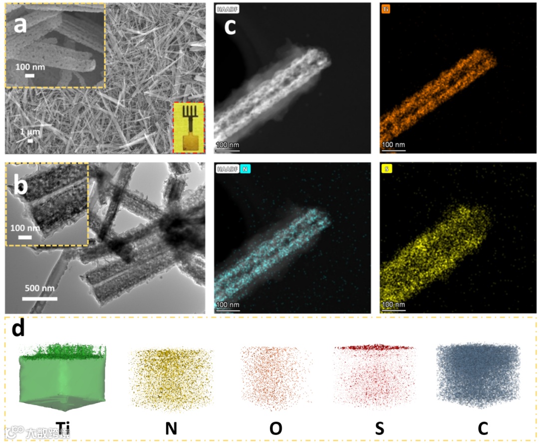 通过简易的电化学沉积,在介孔TiON纳米线结构原位生长了PEDOT包覆层。如图2b显示了引入PEDOT涂层后的连续致密结构和均匀孔隙。图2b-c中的透射电子显微镜(TEM)和高角度环形暗场(HAADF)图像表明,PEDOT导电聚合物牢固地锚定在TiON纳米线上,聚合物层厚度约为30 nm。在TEM图像中,高强度区域对应于单个纳米线的核心,而周围的低强度区域代表PEDOT层。在HAADF图像中,Ti元素在纳米线的核心区域内均匀分布。N元素表现出与Ti相似的分布模式,主要占据核心区。相应的,S元素的分布范围明显更广,包括纳米线的核心和边缘区域,在PEDOT占据的区域内对齐。这些发现表明,在氮化过程中,材料的转变一致且均匀,在PEDOT涂层过程中,材料的生长均匀。为了更好地确定阳极表面和内部结构的化学成分,我们使用飞行时间二次离子质谱(TOF-SIMS)对PEDOT-TiON进行了分析。经过离子束刻蚀后,在TOF-SIMS离子图像中检测并描绘了Ti, N, S, O元素的次级碎片。而在图2d中,TOF-SIMS三维渲染模型显示了PEDOT-TiON微观结构中Ti、N、S、O和C元素的均匀分布,这与上述结论非常吻合。这些结果为PEDOT-TiON NW微电极的成功制备提供了充足证据。