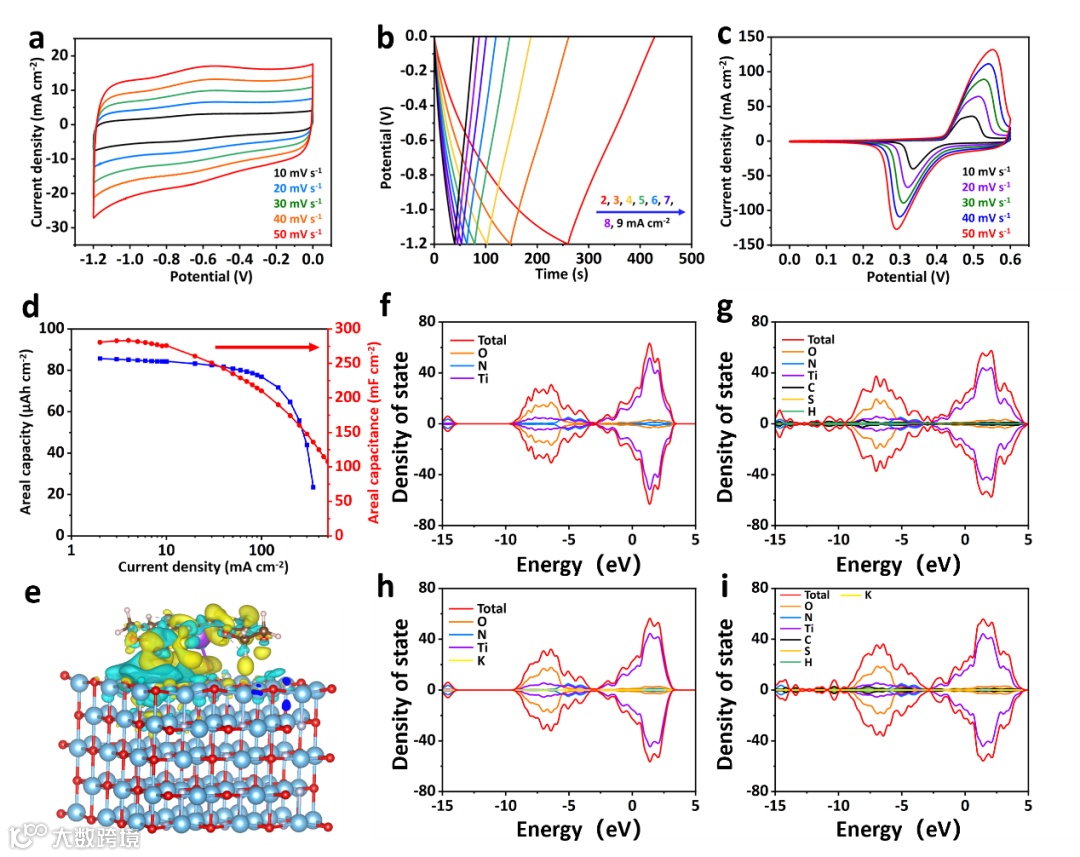 图3 (a-b) PEDOT-TiON纳米线微电极的CV和GCD曲线。(c) Ni(OH)2纳米结构微电极的CV曲线。(d)不同电流密度下PEDOT-TiON NW和Ni(OH)2纳米结构微电极的面容量/电容。(e) PEDOT-TiON界面的电荷密度差等面。(f) TiON,(g) PEDOT-TiON,(h) TiON吸附K+和(i) PEDOT-TiON吸附K+的DOS。