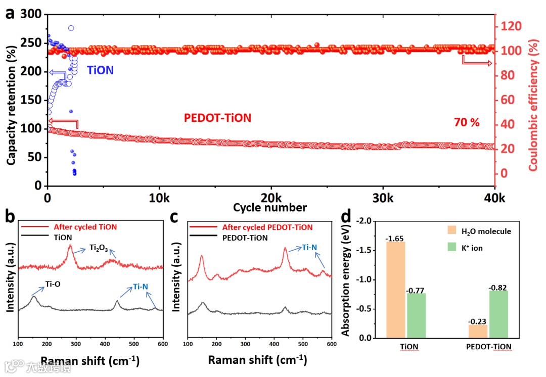 图4 (a) TiON和PEDOT-TiON微电极的循环性能。原始和长循环侯微电极的拉曼光谱(b) TiON NW微电极,(c) PEDOT-TiON NW微电极。(d) H2O分子和K+在TiON和PEDOT-TiON表面的吸附能。