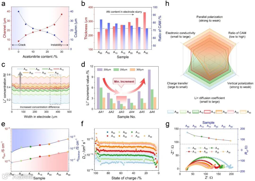 通过实验分析与理论模拟的结合,研究团队深入探究了微观结构与离子/电子扩散动力学之间的相互作用,并在此基础上解耦了复合电极中电子与离子的传输过程。同时,建立了一个多因素相关的厚电极设计标准,这一标准不仅考虑了电极的微观结构,还考虑了动态传输的特性。