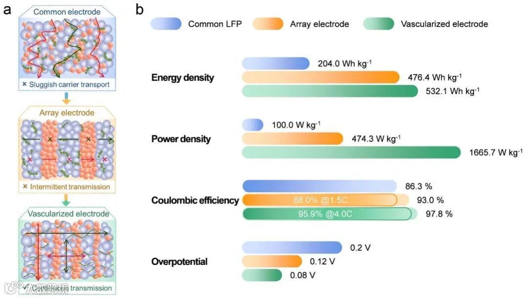 厚电极设计通过最小化器件层面的非活性组分比,可以显著提高电极活性物质的负载,为提高电池的总体能量密度提供了一个良好的平台。然而,厚电极内部的离子-电子动力学复杂性,尤其是其厚度依赖性,给固态电池的实用化进程带来了挑战。常规湿法工艺制备的电极材料随机的密堆叠,导致了极其曲折和缓慢的离子纵向传输路径。而单一离子传输优化的电极,例如低迂曲阵列结构,在低倍率条件下能够展现出色的表现。然而,当电池工作在更高的倍率时,电子传导的迟缓成为了限制电荷交换反应的关键因素,进而导致功率密度降低。为了应对这些挑战,必须合理设计电极的内部电路,以确保高效的离子-电子传输。研究团队从生物输运系统汲取灵感,创新性地设计了一种脉管式电极结构。这种结构通过在电极内部模拟生物血管系统,创建了电子静脉与离子动脉的功能共享毛细管,从而实现了离子和电子的高效传输。