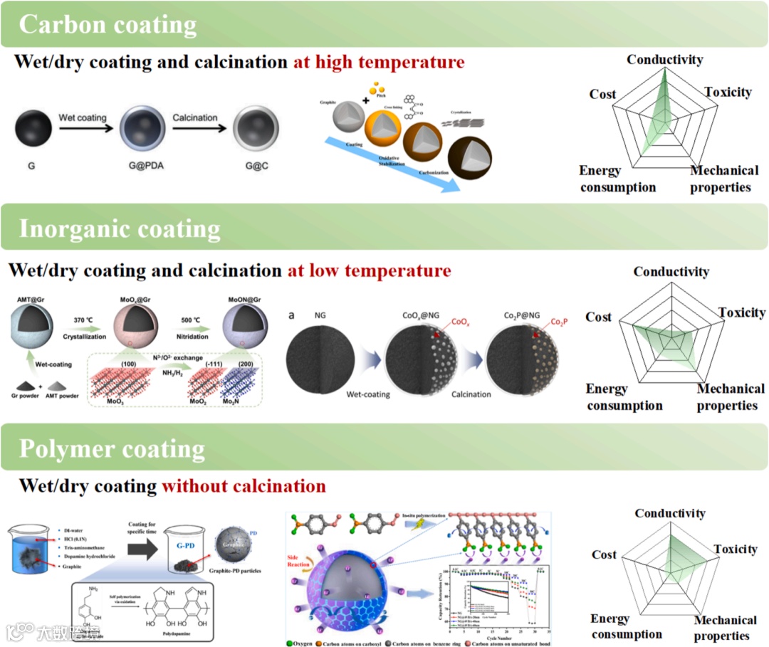 通过设计包覆层,在天然石墨负极和电解质之间建立一个稳定的界面,可以减少电解质的分解和石墨烯层的剥离。该方法有效地提高了天然石墨负极的循环性能。目前主流的界面设计主要包括碳包覆和人工SEI设计,如无机层包覆和有机层包覆。其中,碳包覆具有较高的离子电导率,但通常需要高温热解过程,增加了能量消耗。无机包覆具有较高的机械强度,而有机包覆的特点是能耗和成本较低,但可能涉及具有潜在毒性的原料。包覆层的分类和优缺点如图2所示。