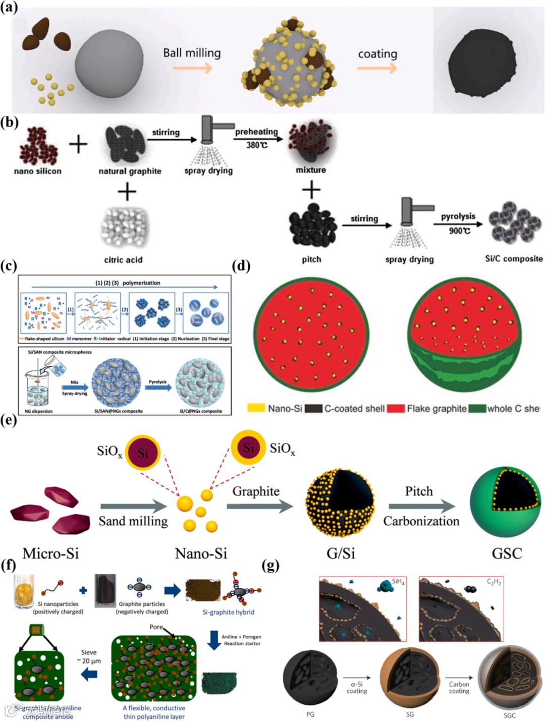 在提高锂电池能量密度上,石墨硅复合负极具有相当大的应用前景。硅的加入提高了石墨负极的比容量,同时石墨的高稳定性有助于缓解与硅负极相关的体积膨胀问题,确保了复合负极良好的循环稳定性。制备石墨硅复合材料的方法多种多样,包括球磨、喷雾干燥、液相法和化学气相沉积(CVD)等,本文对其进行了详细介绍。(图4)