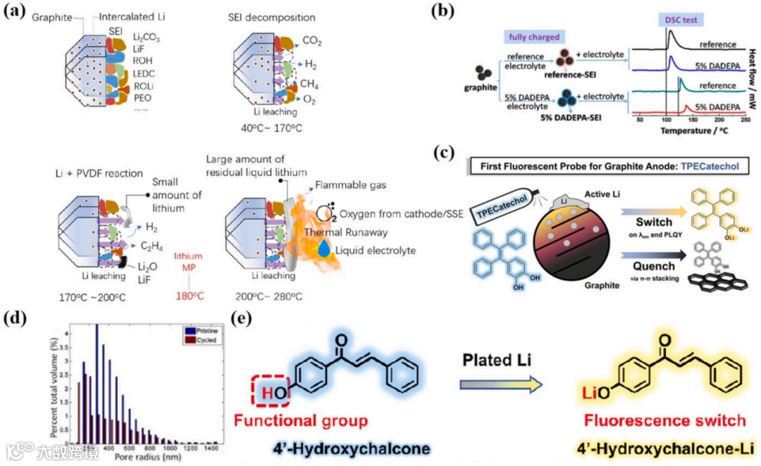 最后,本文还讨论了石墨负极的热稳定性问题。锂化石墨在高温下锂会逐渐从石墨中脱出,石墨表面的高活性锂会与石墨表面SEI、粘结剂等物质反应,带来巨大的安全隐患。通过电解液改性以及石墨表面改性可以提高其热稳定性,此外,从粒径、缺陷等角度调控石墨体相结构也是改善热稳定性的有效方式。(图5)
