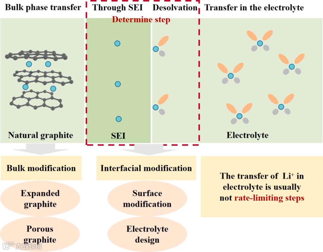 天然石墨负极的快速充电性能受到界面和体相Li+输运的限制。表面改性和电解质配方设计可以促进Li+在界面上更快的脱溶速率,并提高Li+在SEI层内的输运。在石墨体相中引入孔隙可以增加Li+的扩散路径,而通过膨胀石墨层可以促进Li+在石墨片层之间的扩散。本文从石墨负极表面改性、电解液设计、多孔石墨和膨胀石墨等方面详细介绍了石墨负极快充策略。(图3)