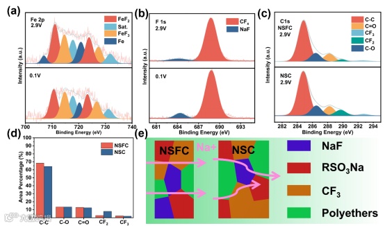 通过采用XPS对不同电位下的电极材料进行分析,验证了Fe在Na+存储过程中的参与。在Na+的插入和脱出过程中,FeFx和Fe的相对含量发生了变化。这一现象归因于Fe和FeFx在Fe和NaF之间的可逆转变,该过程促进了更多的可迁移Na+参与电化学反应,从而增强材料的储钠能力。此外,经Fe修饰的N/S共掺杂固体电解质界面(SEI)膜中,有机组分的比例显著降低。这种组成上的优化减少了界面阻抗,有利于Na+的快速穿梭。铁的修饰在N/S共掺杂炭材料中实现了多方面的性能提升,包括更高的储钠容量和更快的离子传输动力学。