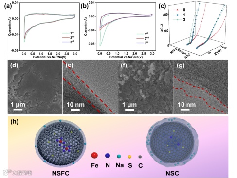 图3. NSFC(a)和NSC(b)在 0.1mV/s扫描速率下前3次CV循环曲线;(c) NSFC和NSC的EIS曲线;NSFC(d,f)和NSC(e,g)在0.05A/g电流密度下循环2圈后的SEM和TEM图像;(h)NSFC和NSC中Na+穿梭路径示意图