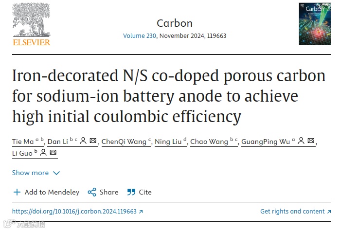 近日,来自中北大学的李丹在国际知名期刊Carbon上发表题为“Iron-decorated N/S co-doped porous carbon for sodium-ion battery anode to achieve high initial coulombic efficiency”的学术论文。本研究利用Fe修饰N/S共掺杂的多孔炭,研究了Fe-N对于SEI膜转化过程的催化机理以及性能提升机制。Fe在电化学反应过程中参与了无机钠盐NaF的转化,释放出大量可供迁移的Na+并抑制SEI膜的过度生长。因此,Fe修饰的N/S掺杂多孔炭表现出371.3mAh/g的比容量以及85.9%的首次库伦效率。