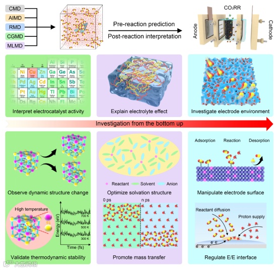 图1. MD模拟在电催化CO₂还原中的应用示意图,展示了如何通过连接宏观实验观察与微观反应机制,提供更深入的理解和解析。