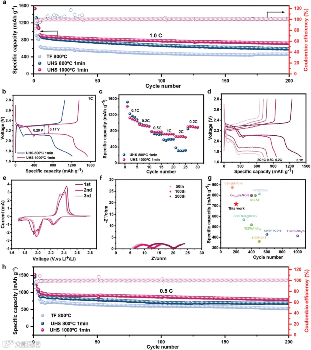 图2:ZIF-67作为硬碳材料组装的锂硫电池的性能