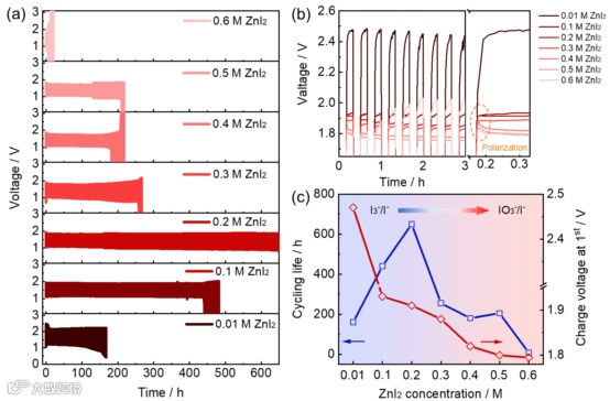 图1. 具有不同浓度ZnI2添加剂的锌-空气电池的循环稳定性。