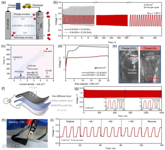 使用碳黑催化剂组装的锌空气电池在含0.2 m ZnI2添加剂的电解液中可以实现稳定循环性超过600小时,并且最终充电电位保持在1.87 V左右。另外,使用高速相机可以观测到在含0.2 m ZnI2添加剂的电解液中碳催化剂表面产生小且密集的氧气泡,这主要得益于在碳催化剂表面均匀分散的I3-氧化还原介质。为了验证可充电锌-空气电池的商业应用前景,将6 M KOH + 0.2 M Znl2封装在聚合物PVA中获得凝胶电解质,组装的柔性锌-空气电池也实现了低的充电电压和长的循环稳定性。