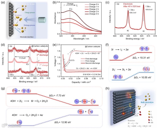 对于I氧化主导的锌-空气电池来说,I-在循环过程中逐渐氧化为IO3-,随着循环圈数的增加,电解液中IO3-的浓度也会逐渐增加,这加速了对催化剂的腐蚀,从而影响电池的循环稳定性。相比之下,对于I3-介导的氧析出反应,可逆的I3-/I-氧化还原过程不会影响电解液中I-的浓度,并且I3-可以与OH-自发反应生成氧气,显著降低了电池的充电电位,从而实现超长的循环稳定性。在标准三电极体系中进行CV测试深入分析氧化还原过程,可以发现乙炔黑催化剂在0.1 m KOH电解液中可以实现可逆的I3-/I-氧化还原反应,从而增强氧析出反应的活性。