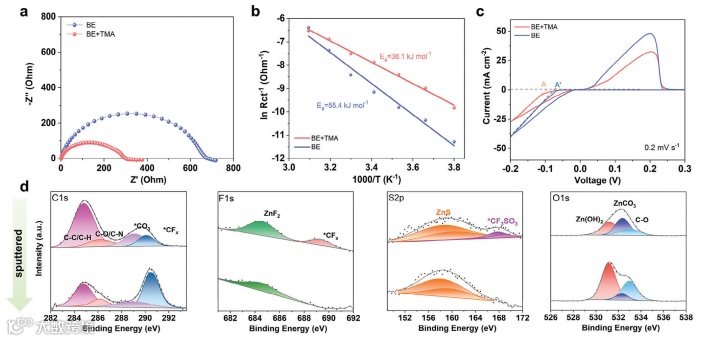 图6.锌阳极的界面行为。a)新鲜状态下锌电池的电化学阻抗谱。b)由Arrhenius方程计算的锌阳极在电解质中的脱溶剂活化能。c)在0.2 mV s-1时记录的CV曲线。d)循环后Zn阳极表面C1s、F1s、S2p、O1s的XPS深度分布图
