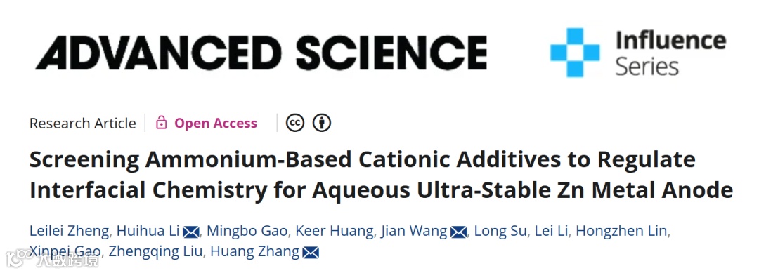近日,来自哈尔滨理工大学的张皝教授、李会华副教授与德国卡尔斯鲁厄理工学院/亥姆霍兹乌尔姆研究所的王健博士合作,在国际知名期刊Advanced Science上发表题为“Screening Ammonium-Based Cationic Additives to Regulate Interfacial Chemistry for Aqueous Ultra-Stable Zn Metal Anode”的观点文章。本文章筛选了一系列不同的阳离子铵基电解质添加剂,有效地调节了水溶液中锌阳极的界面化学性质,显著提高了锌金属电镀/剥离过程的可逆性。研究表明阳离子的结构在Zn晶面上具有不同的吸附行为:随着尺寸的增大,R1N+、R2N+和R3N+阳离子在Zn(002)、(100)和(101)平面上的吸附能增加,表明更有利的吸附有助于减少Zn电极与水之间的接触。通过理论计算和分子动力学模拟相结合的初步综合研究,确定了四甲基铵阳离子以其特殊的分子结构和电荷分布,在电极/电解质界面处调解Zn(H2O)62+溶剂化壳结构中起关键作用,并通过x射线和光学测量显示其具有较强的抗电解质腐蚀能力。