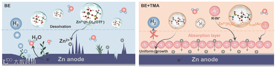 图1. 锌在BE和BE+TMA电解质中的沉积行为示意图。