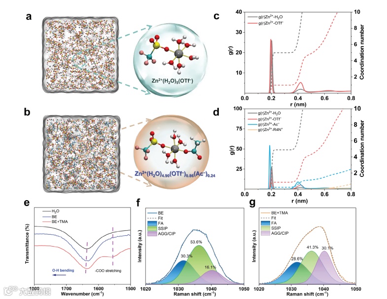 为了说明这些水溶液电解质的溶剂化结构演变,进行了分子动力学(MD)模拟。证实了Ac-阴离子可以竞争性的参与了溶剂化壳层,相互作用更强。形成了Zn2+(H2O)4.90(OTf-)0.86(Ac-)0.24团簇(图3a-d)。随着TMA添加剂的加入,对应H2O的H-O弯曲振动的峰发生了轻微的蓝移,表明H-O的键能增加(图3e)。结果表明,添加剂可以通过更强的氢键相互作用来稳定水团,并减少自由水。如图3f、g所示,与BE相比,BE+TMA电解质中CIP/AGG的比例从16.1%急剧增加到30.1%,表明TMA促进了溶剂化壳的演化,这有利于阴离子络合物的还原形成SEI。具有对称空间结构的R4N+阳离子可以通过静电屏蔽效应抑制枝晶的生长,而OTf-阴离子可以诱导形成坚固的固体-电解质间相层。