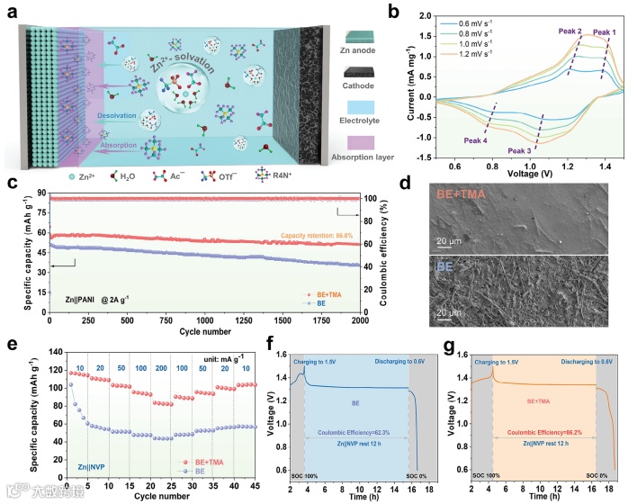 图7.全电池的电化学性能。a) BE+TMA电解液中Zn||PANI电池示意图。b)不同扫描速率下BE+TMA电解液中Zn||PANI电池的CV曲线。c)在2 A g-1下的长期循环稳定性。d)循环Zn//PANI电池在Zn金属阳极上记录的SEM图像。e) Zn//NVP电池的速率性能。f,g) Zn//NVP电池的自放电行为,表现出自腐蚀效应。