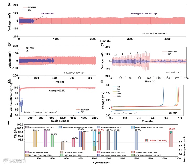 铵基阳离子添加剂的加入形成了吸附界面,显著降低了锌表面的尖端效应,保证了Zn2+在整个电极上的均匀吸附。因此,使用含TMA的电解质,金属Zn被均匀地镀上,没有枝晶生长,并且有效地减少了析氢和腐蚀等副反应。在0.5 mA cm-2下,使用TMA添加剂的电池表现出稳定的电压曲线,没有任何树突,延长寿命>4460小时(超过185天)。在0.5 mA cm-2下,BE+TMA电解液中的Zn||Cu电池在2100次循环中表现出显著延长的循环寿命,平均CE高达≈99.8%。