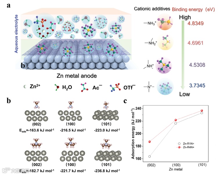 图2. 铵基阳离子添加剂的理论认识。a) R1N+、R2N+、R3N+和R4N+阳离子到OTf-阴离子的分子式和结合能BE。b) R1N+和R4N+阳离子在Zn(002)、(100)和(101)表面的吸附能。c) Zn吸附R1N+和R4N+后,Zn原子在不同晶面上的吸附能。