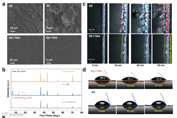 图5.锌阳极在不同电解质中的结构演变。a)从Zn||Zn电池中回收的循环Zn阳极的SEM图像和b) XRD图谱。c)在电流密度为10 mA cm-2时,随电镀次数的增加,锌箔上锌沉积的截面形貌演变的原位光学显微镜图像。d)锌金属箔上电解液的接触角测量。