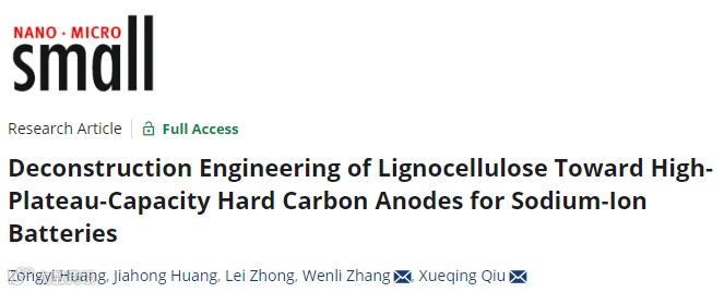近日,来自广东工业大学的邱学青教授和张文礼教授在国际知名期刊Small上发表题为“Deconstruction Engineering of Lignocellulose Toward High‐Plateau‐Capacity Hard Carbon Anodes for Sodium‐Ion Batteries”的文章。该文章提出了一种利用氢氧化钠选择性的刻蚀破坏了竹子紧密的木质纤维素结构的方法制备硬炭前驱体,最终实现了平台容量的大幅提升。本研究为利用生物质开发高封闭孔体积的硬炭负极实现高效钠离子储存提供了一种方法。