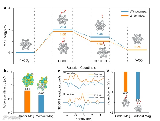 图4. Ni@NC催化剂a)自由能图。B)有无磁场下的差分电荷图以及COOH*吸附能。c)TDOS图和d)有无外部磁场下金属Ni d带中心。