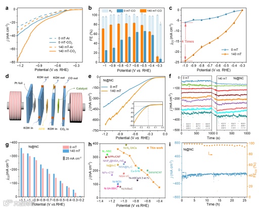 电化学测试结果表明,当Ni@NC催化剂在外加磁场的条件下工作时,不仅具有较低的过电位,而且在一个宽电压范围内实现了接近100%的CO法拉第效率。
