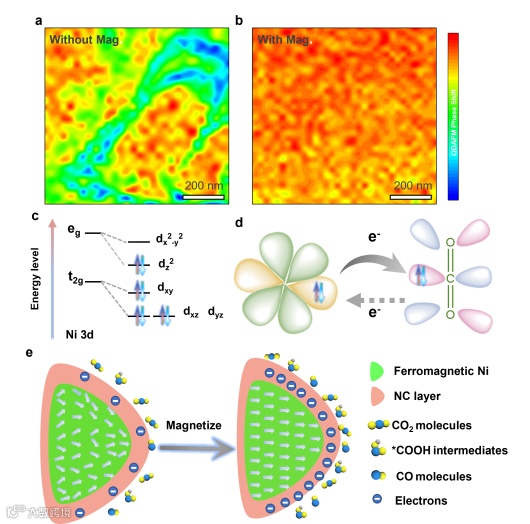图3 Ni@NC 催化剂的QDAFM图a)无磁场,b)有磁场。(红色表示磁畴;蓝色表示磁壁)。c)金属镍原子d轨道电子构型示意图。d)Ni和CO2电子相互作用。e)铁磁性镍的磁畴在外加磁场下重排。