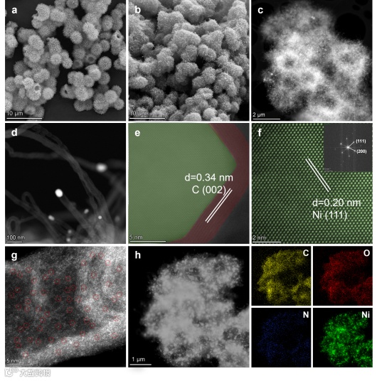 图1. a)Ni-MOF前体和b)Ni@NC催化剂的SEM图。c,d)TEM图。e,f)镍纳米粒子的HAADF-STEM图。G)Ni@NC催化剂的HAADF-STEM图。H)Ni@NC催化剂的HAADF-STEM图像和元素Mapping图。