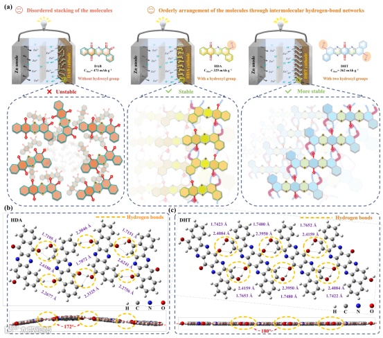 图1. (a)在DAB、HDA和DHT正极中的分子间氢键网络的结构示意图。(b)HDA中分子间氢键优化结构的正视图和侧视图。(c)DHT中分子间氢键优化结构的正视图和侧视图。