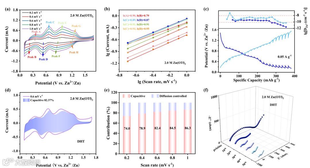 图3. DHT的反应动力学探究:(a)不同扫描速率下的CV曲线。(b)拟合计算出的b值。(c)DZn2+值。(d)在0.6 mV s−1时电容控制的贡献。(e)不同扫描速率下非扩散控制和扩散控制的容量贡献。(f)在10 A g−1下DHT正极在初始、第10、第20、第20、第300、第40和第50次循环后的EIS图。