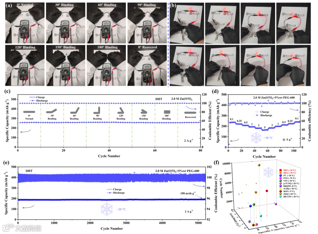 图6. 柔性实验:(a)带状电池Zn||DHT电池不同角度下的弯曲试验。(b)两个条状Zn||DHT电池在连续弯曲过程中(0-360°)驱动一个LED灯的示意图。(c)在2 A g−1下进行连续和重复弯曲的循环稳定性。在−20 °C下的电化学性能测试:(d)倍率性能。(e)在2 A g−1下的长循环稳定性。(f)比较了这项工作与近期报道的在低温下有机正极的长循环性能。