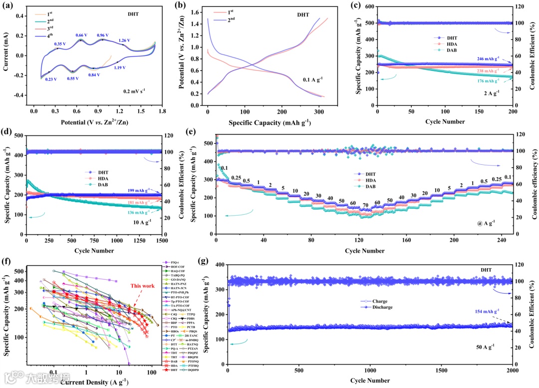 图2. DAB、HDA和DHT正极极的电化学性能:(a)DHT正极在0.2 mV s−1时的CV曲线。(b)DHT正极在0.1 A g−1时的GCD曲线。三种有机正极的在(c)2 A g−1下和(d)10 A g−1的循环稳定性对比。(e)三种有机正极的倍率性能对比。(f)与优势水性锌有机电池的倍率性能比较。(g)DHT正极在50 A g−1下的超长循环稳定性(图2e后的接续测试)。