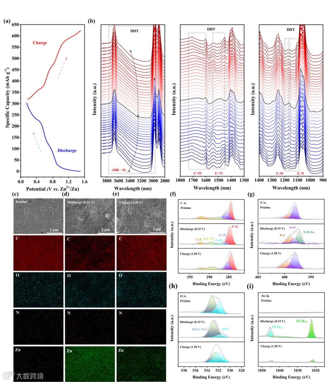 图4. DHT正极(a)在2 A g−1下的 GCD曲线和(b)对应的原位FT-红外光谱。DHT正极在(c)初始、(d)完全放电(0.15 V)和(e)完全充电(1.50 V)状态下的SEM-EDS图像。DHT正极不同状态下(f)C1s、(g)N 1s、(h)O 1s和(i)Zn 2p的XPS谱。