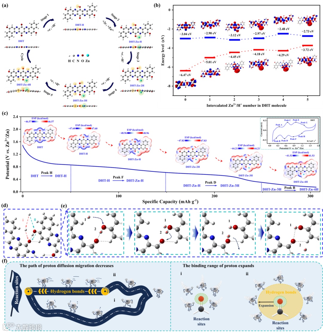图5. (a)由氧化还原过程中DHT正极计算所得到的Zn2+/H+协同存储途径。(b)不同放电态下DHT的HOMO和LUMO能级的变化。(c)储能过程中DHT的ESP变化。(d)在DHT的氢键网络中H+的两种传导路径。基于路径ii下DHT氢键网络中Grotthuss机制下的(e)扩散行为示意图及(f)其两个优势。
