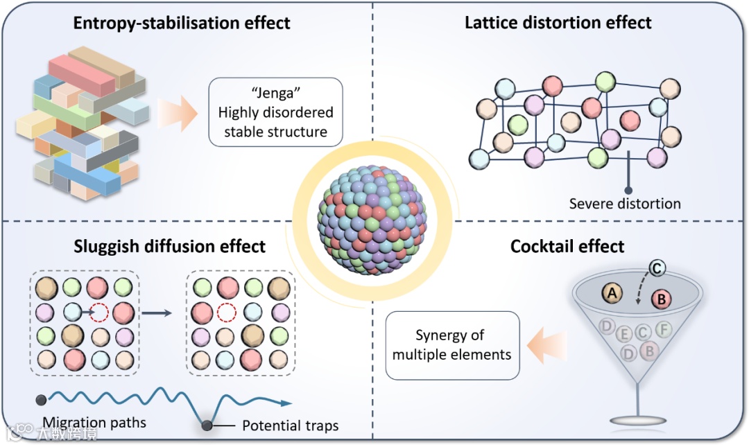 本文针对高熵策略与钠离子层状氧化物优化的三大特性之间的联系进行了深入探讨,系统地审查了这些高熵钠离子层状氧化物最近取得的研究进展。元素之间复杂的相互作用使得HEMs表现出区别于与传统材料的功能特性。对于高熵合金,其四大核心效应可归纳为 (1) 熵稳定效应、 (2) 扩散迟缓效应、(3) 晶格畸变效应和(4) 鸡尾酒效应。