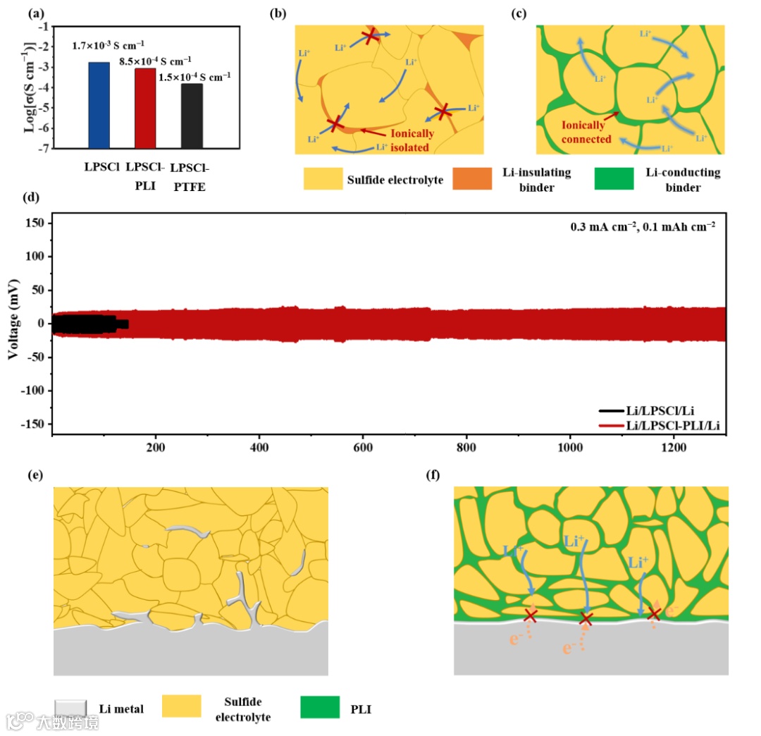 图2 (a)LPSCl、LPSCl-PLI和LPSCl-PTFE电解质的离子电导率;(b)基于离子绝缘型粘结剂和(c)离子电导型粘结剂的硫化物固态电解质薄膜中锂离子传输路径的示意图;(d)Li/LPSCl-PLI/Li和Li/LPSCl/Li对称电池在0.3 mA cm–2电流密度和0.1 mAh cm–2面容量下的循环稳定性;(e)LPSCl和(f)LPSCl-PLI电解质与锂金属负极界面的离子/电子传输示意图。