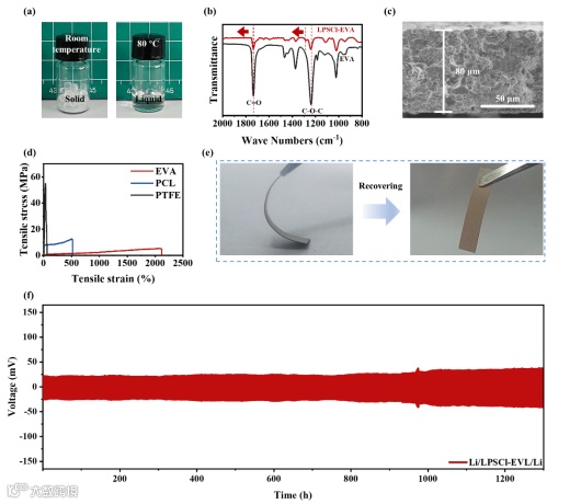 图3. (a)EVA在室温和80 ℃下的光学图像;(b)EVA和LPSCl-EVA样品的FTIR谱图;(c)LPSCl-EVL电解质薄膜的截面SEM图;(d)ECA、PCL和PTFE的应力-应变曲线;(e)室温下LPSCl-EVL电解质薄膜的弯曲性能;(f)Li/LPSCl-EVL/Li对称电池在0.3 mA cm–2电流密度和0.1 mAh cm–2面容量下的循环稳定性。