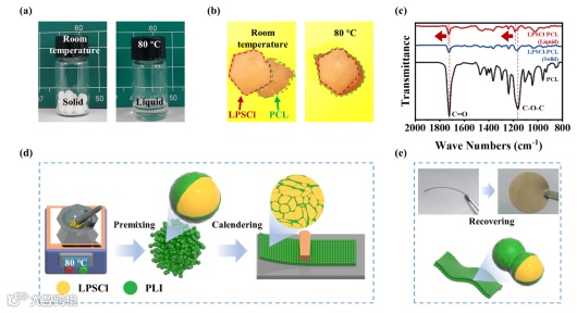 图1. (a)PCL在室温和80 ℃下的光学图像;(b)PCL在室温和140 ℃下与LPSCl电解质接触时的光学图像;(c)PCL、LPSCl-PCL(Solid)和LPSCl-PCL(Liquid)样品的FTIR谱图;(d)LPSCl-PLI电解质薄膜的合成示意图;(e)室温下LPSCl-PLI电解质薄膜的弯曲性能。