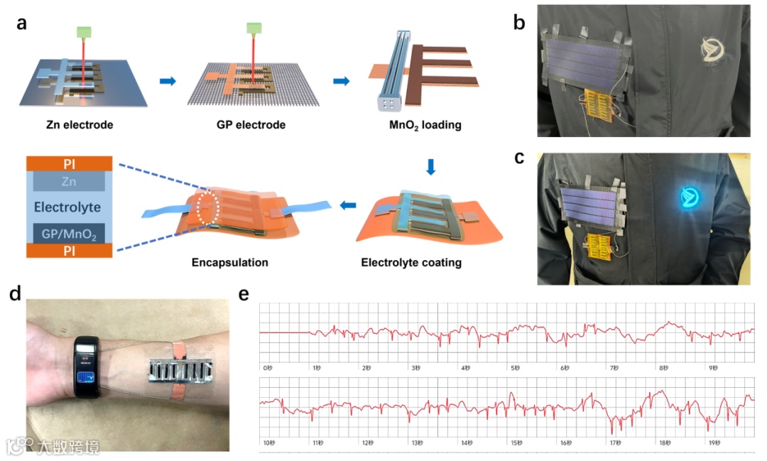 Fig. 6. (a) Fabrication diagram of planar Zn-Mn micro-battery. (b) Solar charging diagram for integrated system. (c) Energy storage system provides energy for wearable electroluminescent devices. (d) Energy storage systems for wearable heart rate monitor. (e) Corresponding human heart rate chart.