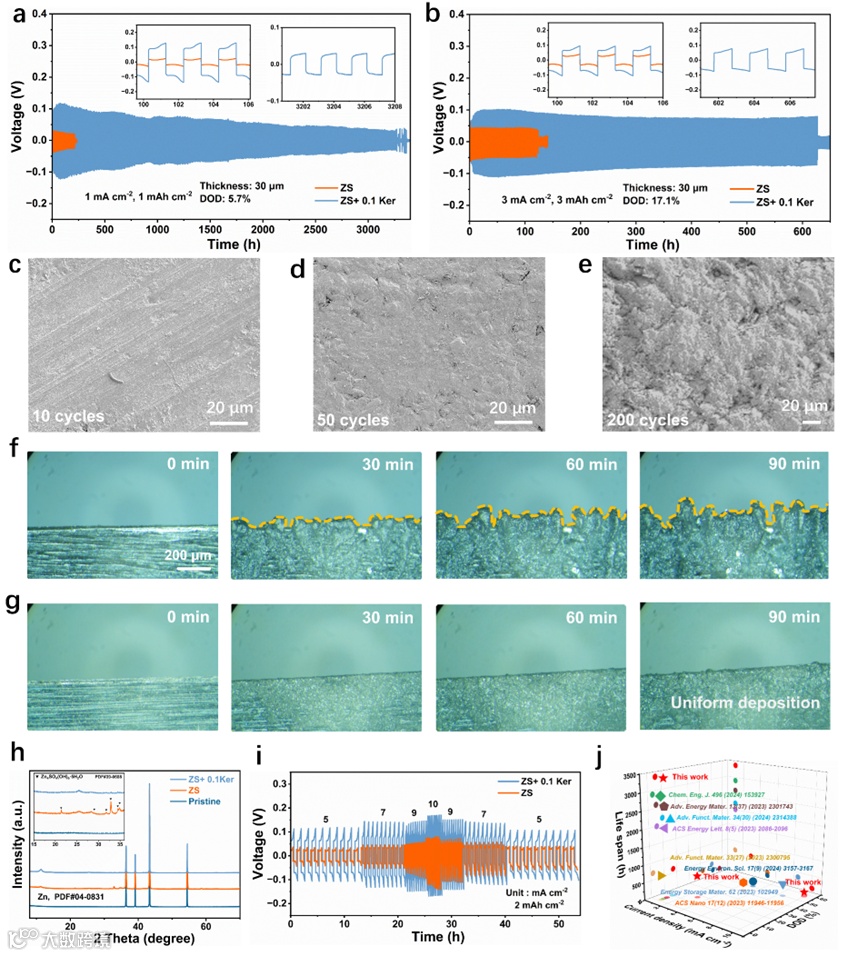 Fig. 4. (a) Cycling performance of Zn||Zn symmetric cells using ZS and ZS + 0.1Ker electrolytes at 1 mA cm−2 and 1 mAh cm−2. (b) Reversity test of symmetric cells at 3 mA cm−2 and 3 mAh cm−2. SEM images of Zn anodes using ZS + 0.1Ker electrolyte after (c) 10 cycles, (d) 50 cycles and (e) 200 cycles. In situ optical microscope images of zinc deposition in (f) ZS electrolyte and (g) ZS + 0.1Ker. (h) XRD patterns after 50 cycles. (i) Rate performance of Zn||Zn symmetric cells. (j) Lifespan comparison between this work and published studies.