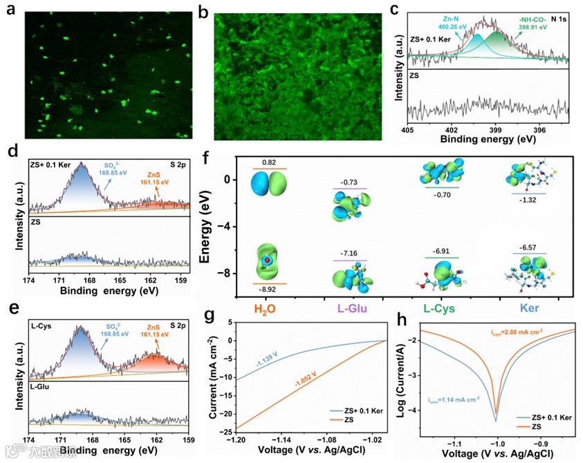 结合L-半胱氨酸和L-谷氨酸在Zn各晶面的吸附状态,发现 L-半胱氨酸-SEI 层中的L-半胱氨酸会诱导大量局部位点促进Zn2+沿水平平面沉积和生长。与含有氧官能团(-OH、-COOH)的其他氨基酸相比,-SH基团参与了SEI层的生成(图5e)。-SH在锌表面的氧化导致了牢固的Zn-S化学结合形成致密的Ker-SEI层,其优化了由原始结构缺陷和初始锌尖端引起的不均匀电场分布,有效抑制了锌枝晶的生长。