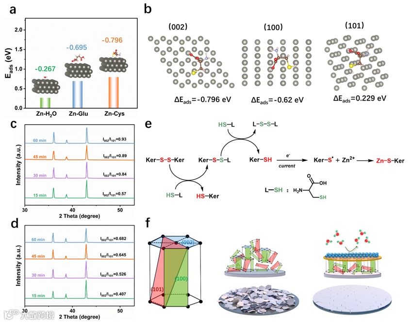 Fig. 5. (a) Adsorption energy of different molecules on Zn(002) slab. (b) Adsorption energy of L-Cys on Zn(002), Zn(100) and Zn(101) facet. XRD pattern of Zn anode in (c) ZS+ 0.1Ker and (d) ZS electrolyte under different discharge time. (e) Reduced pathway of disulfide bonds in Ker. (f) Mechanism of selective deposition of Zn(002) by Ker.