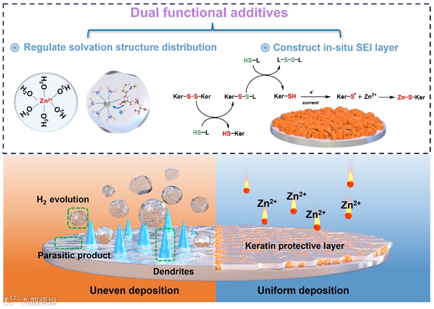 鉴于此,浙江理工大学纺织科学与工程学院轻化工程系胡毅教授课题组,基于纺织染整与新能源的交叉融合创新,报道了一种双功能的生物质电解液添加剂用于提高锌负极循环可逆性,利用毛染整清洁化生产中的还原方法,提取羊毛纤维角蛋白(Ker)并将其应用于AZIBs。多种理论计算验证了添加剂分子的双功能作用,羊毛角蛋白上丰富而复杂的O和N位点与Zn2+具有很强的结合力,羊毛角蛋白的参与导致质子向Zn2+的电子转移的弛豫。大量半胱氨酸(Cys)的具有较低的氧化电位,末端巯基(-SH)倾向于与暴露的Zn(002)面发生氧化还原反应,从而形成致密的固体电解质界面(SEI)。这种稳定的界面层有效地抑制了HER和Zn枝晶的形成,大大提高了器件循环稳定性。相关工作以“Dual functional bio-inspired additives reconstruct metal-organic interface stability for wearable energy storage system”为题发表在国际著名期刊Energy Storage Materials(影响因子18.9)上,论文DOI:10.1016/j.ensm.2024.103797。