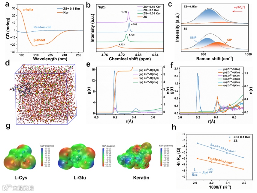 Fig. 2. (a) CD spectrum of Ker and ZS+ 0.1Ker solution. (b) 1H NMR spectra. (c) Raman spectra (ν-SO42− band) of ZS + 0.1 Ker electrolytes with various concentrations. (d) Snapshots of ZS+0.1 Ker electrolyte system at equilibrium from MD simulation. (e) and (f) Corresponding RDFs curves for Zn2+-O(Ker), Zn2+-N(Ker), and Zn2+-S(Ker) collected from MD simulatons in ZS+ 0.1Ker electrolyte. (i) Comparison of activation energy of Zn symmetric cells from Arrhenius curves.