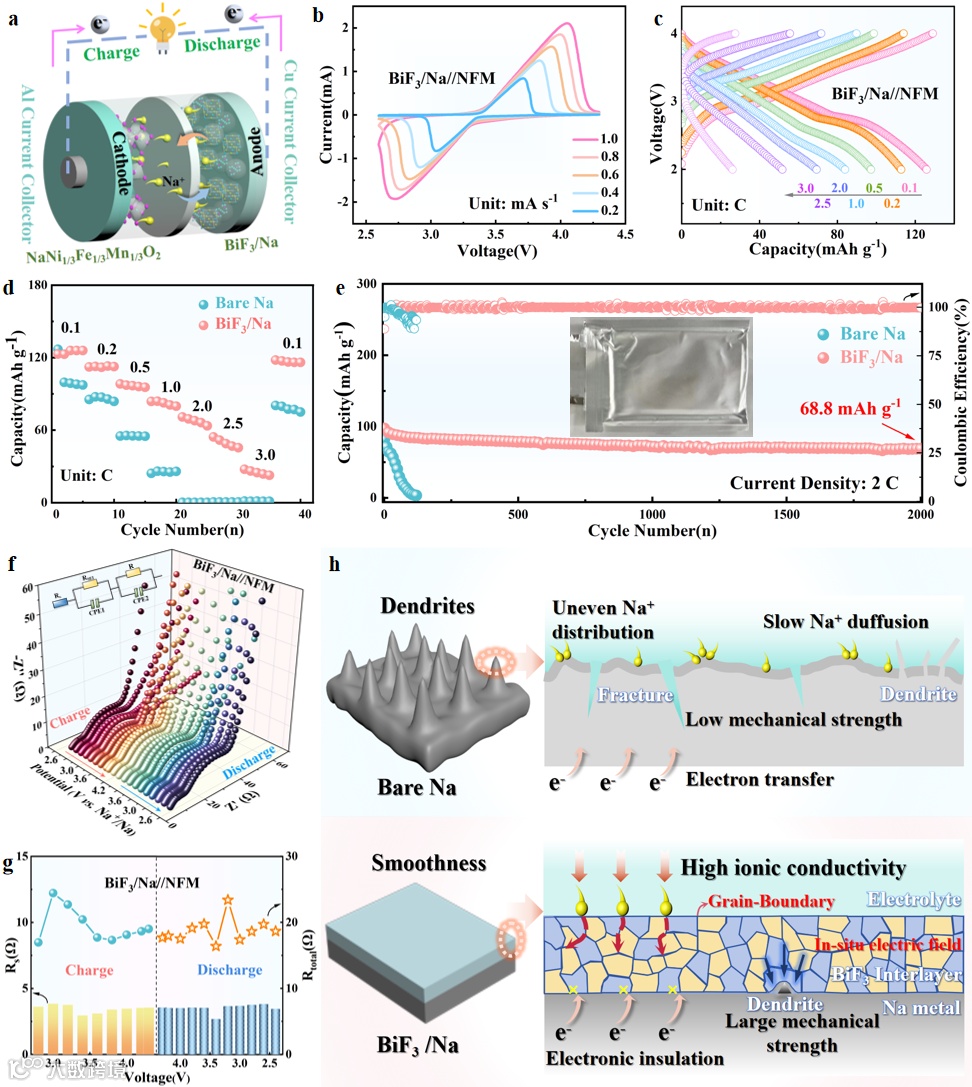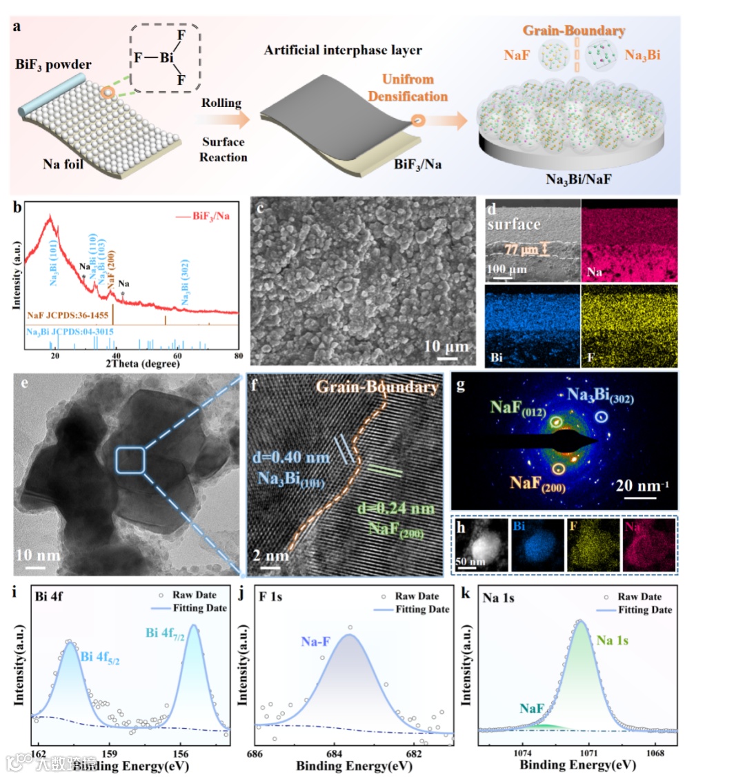 构建高质量的人工SEI层被认为是解决目前钠金属电池负极枝晶问题的有效途径。在这项工作中,我们提出了一种高密度晶界策略来抑制钠枝晶的不可控生长,通过简单的机械轧制方法在钠金属表面原位构筑一层兼具有高离子电导率和电子绝缘性的双功能界面层(BiF3/Na)。当BiF3纳米粉末与金属钠直接接触时,基于法拉第电子得失反应,钠金属表面会自发形成双功能Na3Bi/NaF异质层。在该保护层中,具有高亲钠性的离子导电Na3Bi组分大大避免了Na离子在Na金属表面的不均匀沉积和优先成核,而具有高界面能和机械强度的NaF相的可有效地抑制Na枝晶的不可控生长。最重要的是,Na3Bi/NaF异质相间高密度晶界会诱导内置电场的形成,显著提高Na+扩散速率、减小电池极化,从而保障Na+反复沉积剥离过程中的稳定性。基于此,覆盖有这种先进高密度晶界人工修饰层的钠金属负极在高倍率下展现出了优异的循环稳定性,BiF3/Na电极制备的对称电池在2 mA cm-2/1 mAh cm-2的测试条件下可稳定工作2000小时。此外,制备的BiF3/Na||NaNi1/3Fe1/3Mn1/3O2钠金属软包全电池也表现出优异的电化学性能,其在2 C大电流下经2000次循环后的可逆比容量仍高达68.8 mAh g-1,具有突出的实际应用潜力。