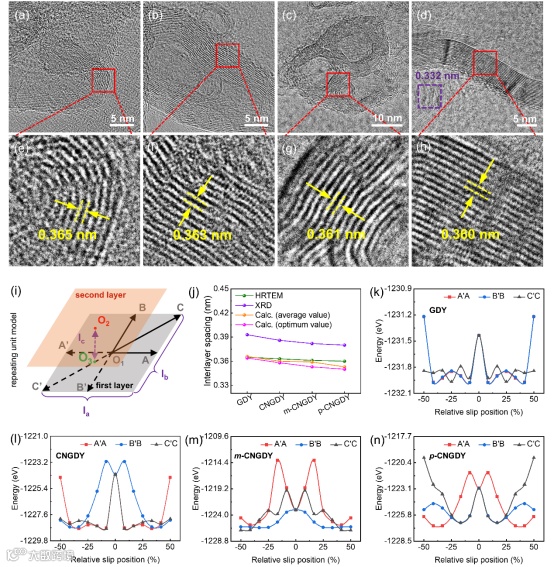 图 2. 层间距和理论堆叠模式。(a−h) GDY(1)(a,e)、CNGDY(2)(b,f)、m-CNGDY(3)(c,g)和 p-CNGDY(4)(d,h)的 HRTEM 图像。(i) 以晶胞为单位的两层堆叠模型示意图。(k−n) 计算的 1−4 不同堆叠位置对应的总能量。(j) 1−4 层间距的实验(HRTEM 和 XRD)和计算结果。