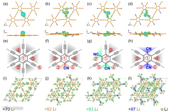 图5. 1−4对锂吸附的第一性原理计算。(a-d)1−4吸附锂原子电荷密度差的顶视图和侧面图,密度等值面值为0.002 e/Å3。(e-h)1−4锂原子的吸附位点选择。(i-l)在保证结构完整性的前提下,理论上1−4单层吸附锂量最大的球棍模型顶视图。